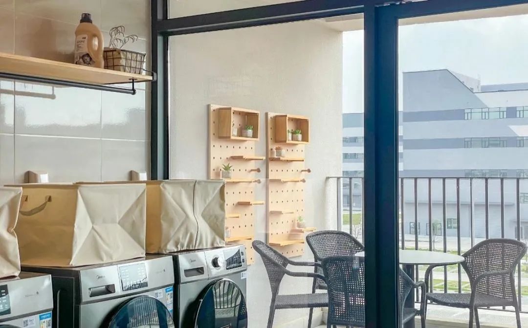 宿舍内配备公共洗衣房,熨衣板、洗衣机、晾衣篓、洗手池等设施一应俱全。