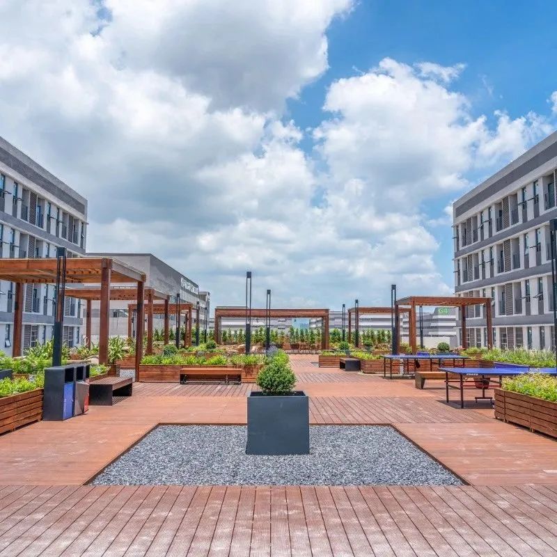 公共服务中心三层平台设置了屋顶花园,形成半开放式创新社区。考虑到公共服务中心宿舍的分布,屋顶花园位于两侧宿舍动线中轴。