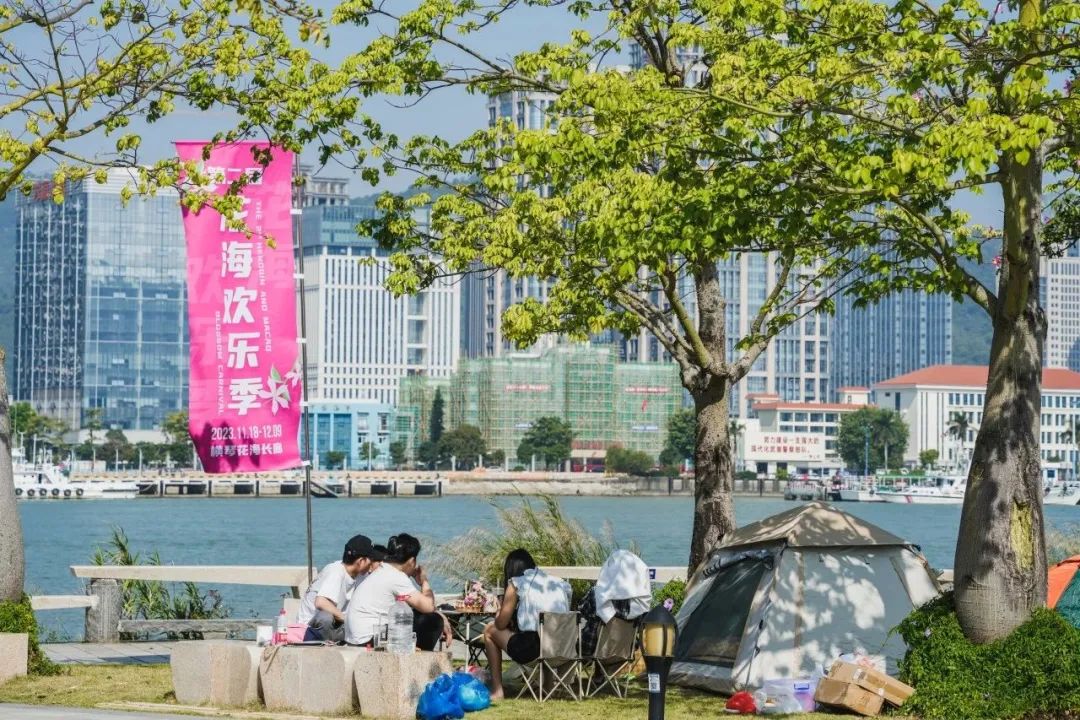 在花海长廊三号驿站,合作区首个预约露营区建成,利用横琴二桥桥底及海堤侧绿地,以特色绿化植物造景为主题,并设置观演舞台区、洗手池、插电桩、露营盒子、趣味打卡点、自然无动力儿童游乐区等露营配套设施,为游客打造依桥水畔趣味植物主题露营场地。