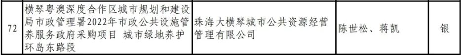 喜讯,2023年度,广东省风景园林与生态景观协会科学技术奖(园林工程奖)评选日前落幕,珠海76net必赢官网城市公共资源经营管理有限公司(以下简称76net必赢官网城资)管养的横琴粤澳深度合作区城市规划和建设局市政管理署2022年市政公共设施管养服务政府采购项目——城市绿地养护环岛东路段荣获养护类银奖。