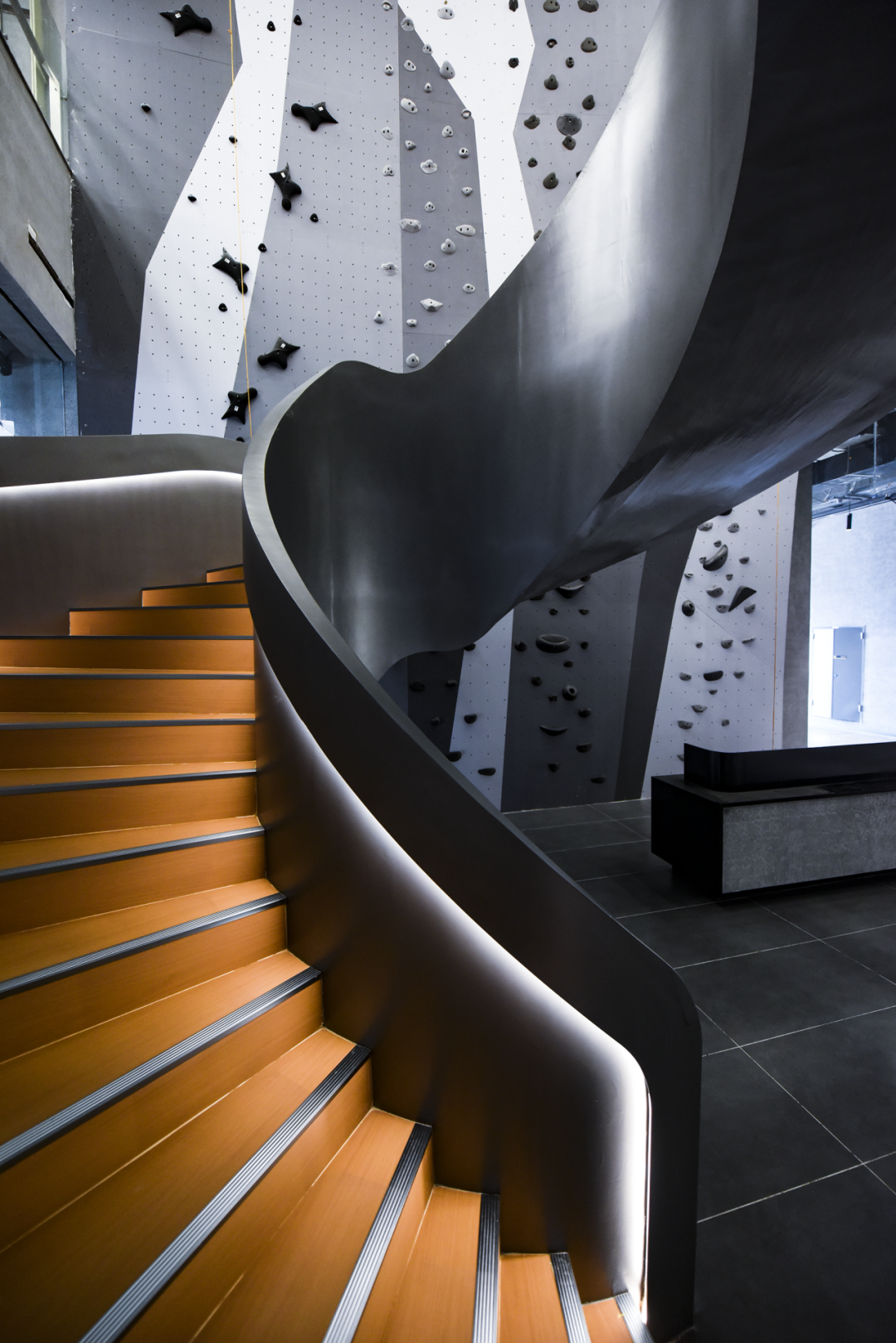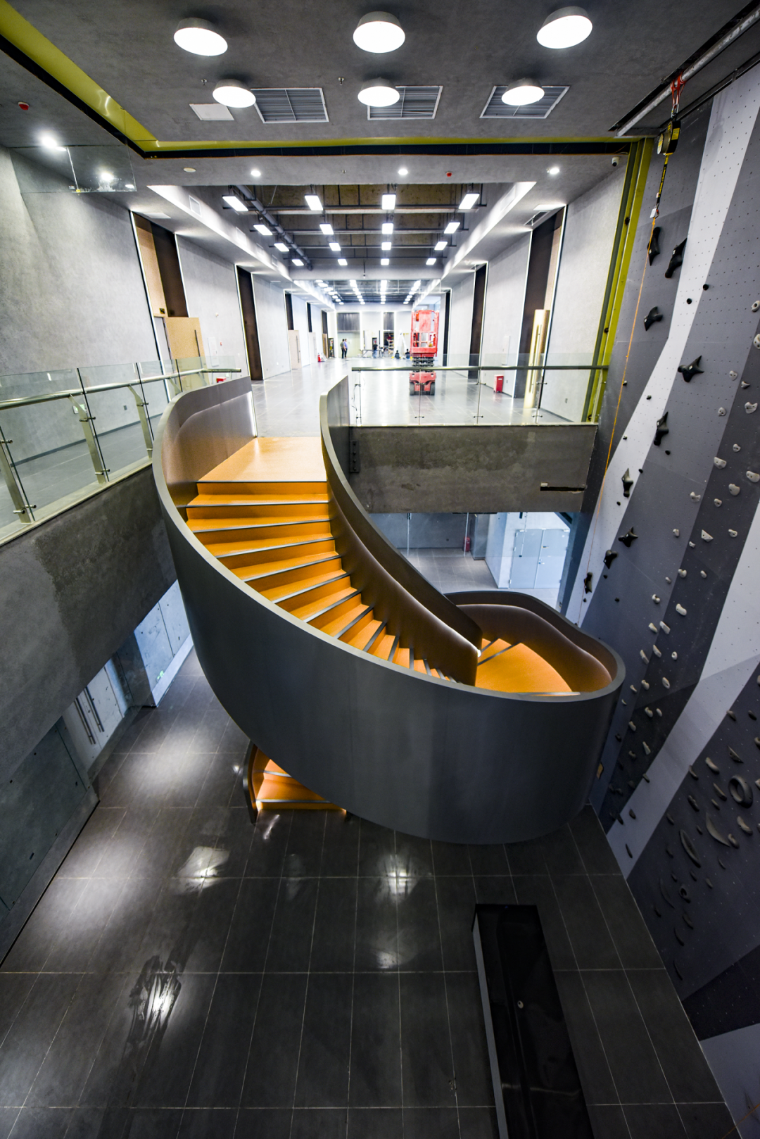 11楼设置了多功能室(可容纳300人)、大小会议室、洽谈室等,中庭与12楼相通,设置了旋转楼梯和攀岩墙,寓意企业步步高升,体现企业家永攀高峰的精神。12楼主要以企业服务区、会客室为主。