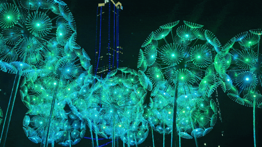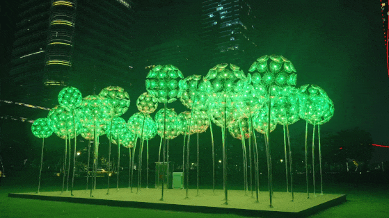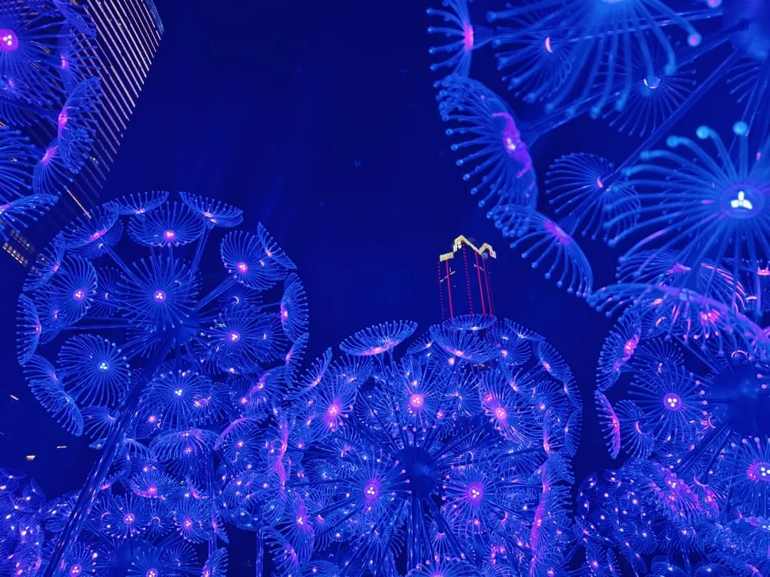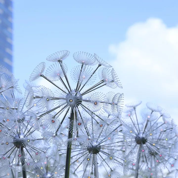 在横琴金融岛中央公园,40支高度为2.5米、直径为0.6米的蒲公英灯饰如同希望的使者,散发着明亮而温暖的光芒,为夜幕下的公园增添了一份璀璨的光彩。