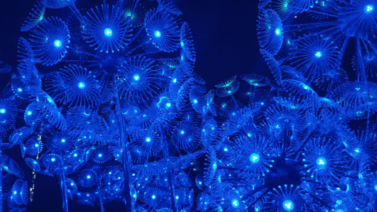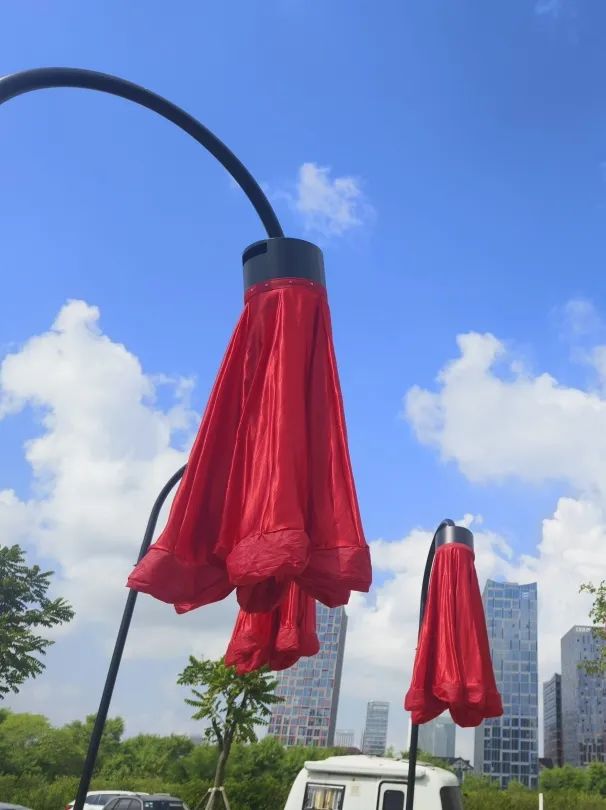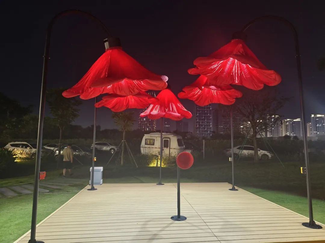 横琴生态泽园的创意灯饰以含苞待放的喇叭花为主体造型,花朵使用充气物料制成,内部藏有感应器。
