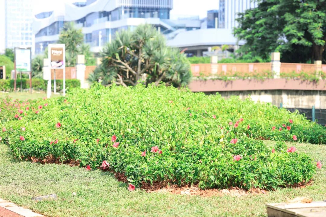 在隆义广场西侧和北侧2处绿地堆造地形并种植桑贝斯凤仙,提升场地的景观效果。