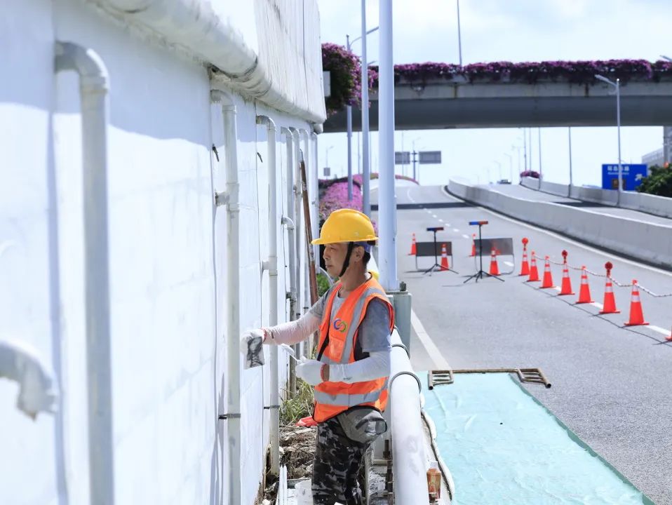 道路、桥梁作为基础交通设施,也是城市景观的重要组成部分。为打造靓丽舒适的出行环境,76net必赢官网城资在港澳大道立交主线桥及匝道、濠江路立交主线桥及匝道进行防撞墙和引桥挡墙的打磨、找平、刷漆等养护作业,施工面积达20000㎡,在美化通行环境、提升路容路貌的同时,切实消除安全隐患,提升了道路通行安全系数。