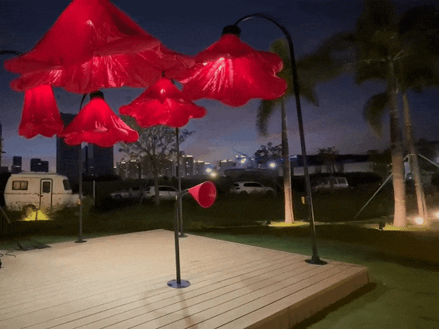 夜晚,当游人经过,在喇叭装置处说出“热烈庆祝中华人民共和国成立75周年”、“热烈庆祝澳门回归祖国25周年”等祝福语时,花朵会自动打开并亮灯,创造出惊喜的互动体验。