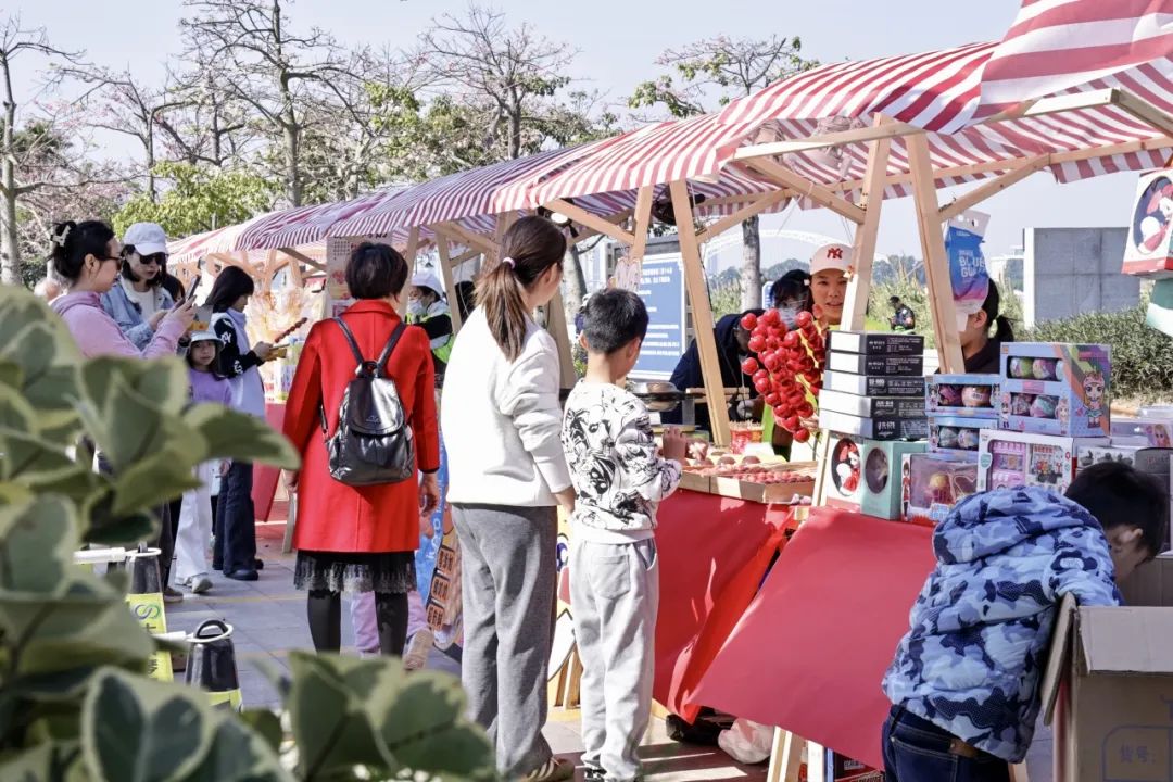 除此之外,每逢周末,一号、二号和三号驿站开展东湾墟市活动,斗门莲洲镇东湾村农产品市集走进花海,带来优质的本地产绿色农产品、特色手工糖水和农副产品、非遗点心小吃等,吸引了大批市民游客上前询问和购买。游客在享受美景、体验美食之旅的同时,亦促进了乡村振兴与满足城镇消费需求的良性循环,乡村市集在花海焕发出了新活力。