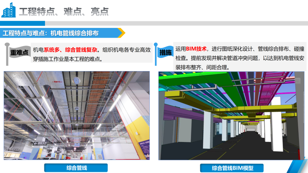 本次获得“2023-2024年度中国安装工程优质奖(中国安装之星)”关键点在于,横琴口岸及综合交通枢纽工程由A区B区、C区主体建筑及南北侧交通平台组成,机电施工内容包括建筑给排水及采暖、通风与空调、建筑电气三个分部工程。作为一个大体量机电工程,项目机电系统多、综合管线复杂。在项目建设过程中,承建团队运用BIM技术,对图纸进行深化设计、对管线综合排布并进行碰撞检查,提前发现并解决管道冲突问题,以达到机电管线安装排布整齐、间距合理,确保了本次顺利“摘星”。