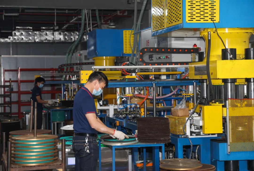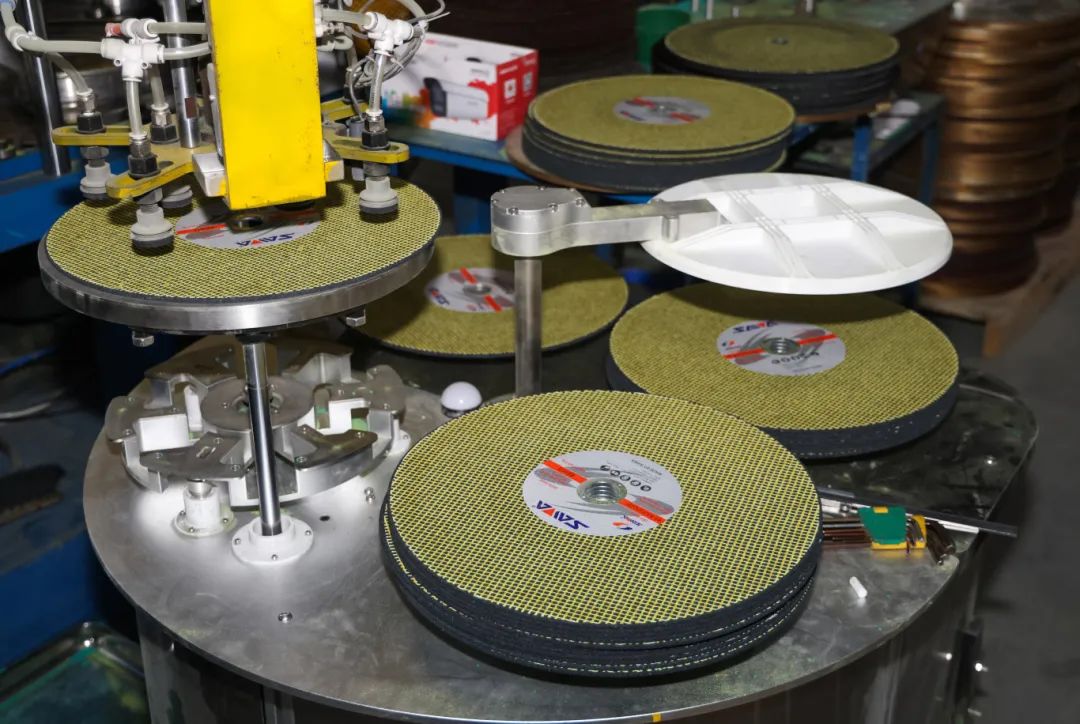 步入车间,智能化设备高效运转,厚度1至6毫米的砂轮经过精密加工后整齐排列,即将发往全球市场。