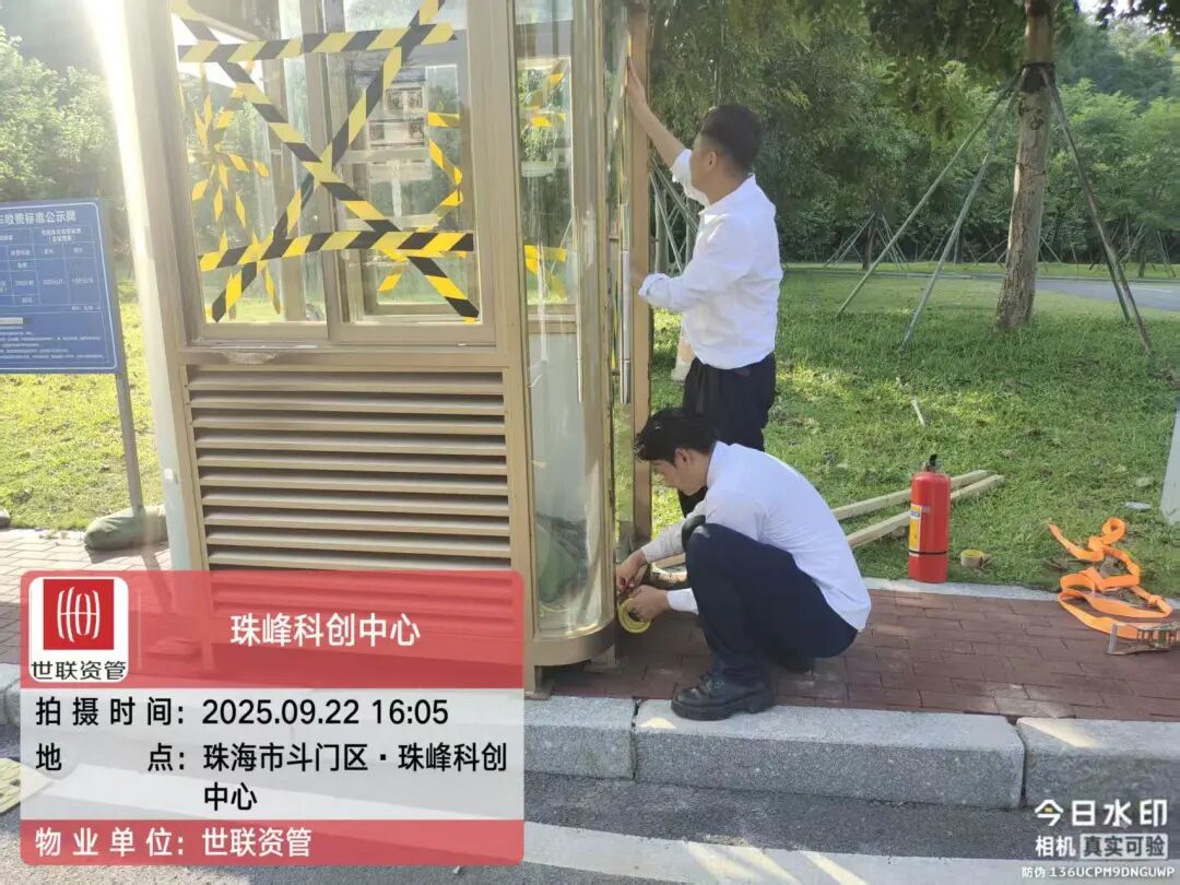 对门窗加装木方、贴米字胶带加固,检查办公设备,关闭非必要用电设备,并对办公区域的安全用电、消防安全、办公设备防护、应急管理措施等进行全方位排查与整治。
