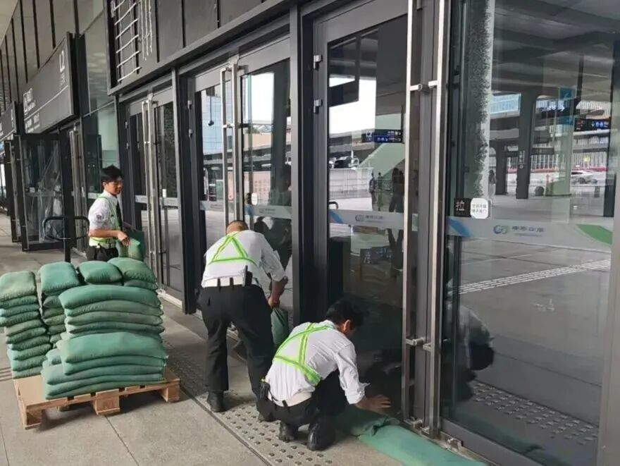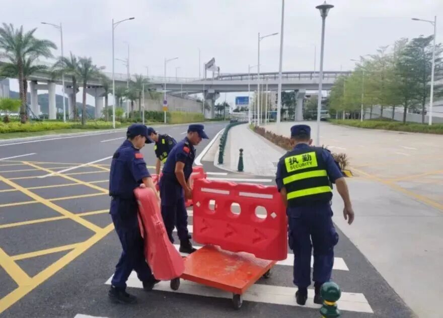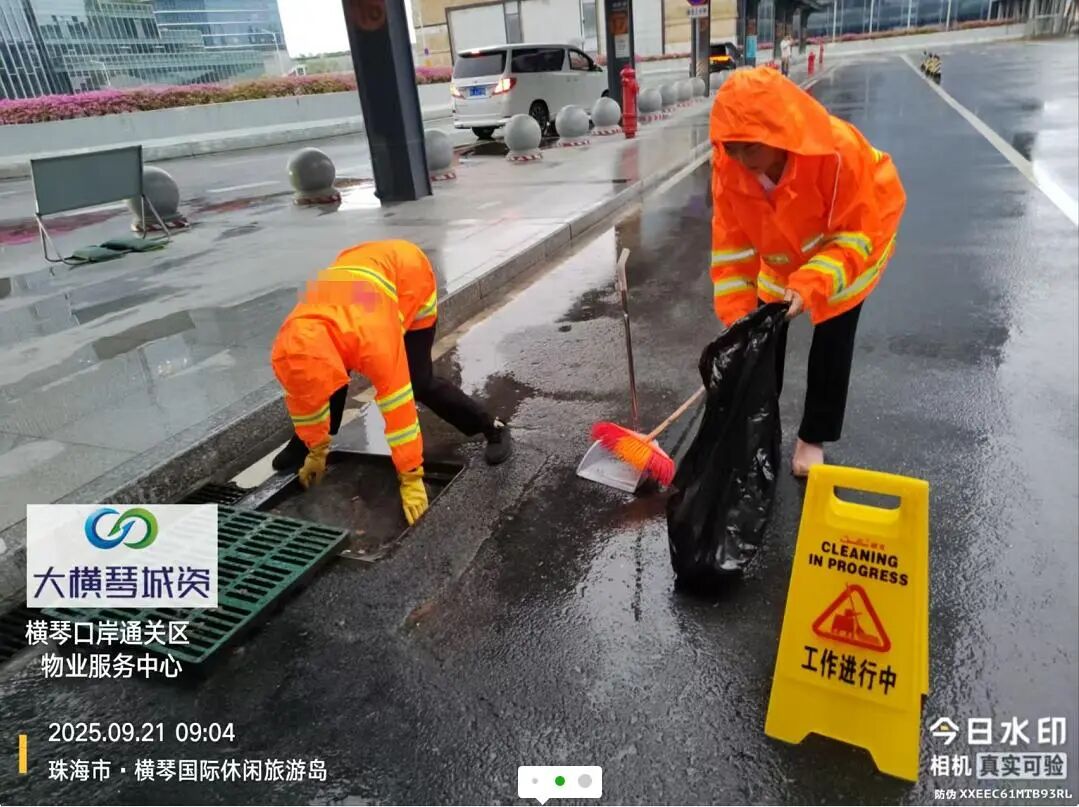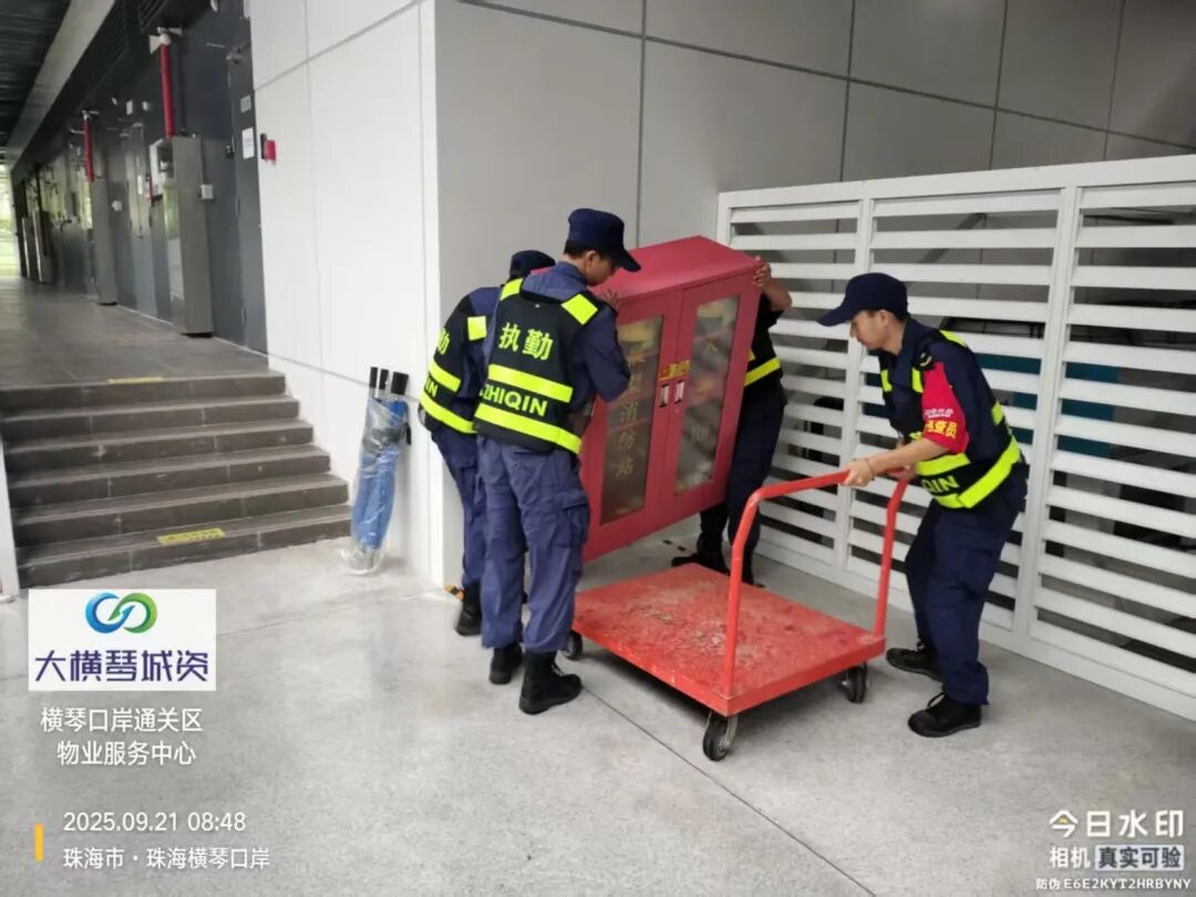 在横琴口岸区域,提前排查200多个集水井,调集230个紧固件加固门窗,近3000条沙袋、近100个防洪挡板、11台水泵等应对福临道、地库36处接驳口、负二层下沉庭院、U行车道等重点区域强排和封堵需要。同时对通关区域的100余扇玻璃门进行加固,在易水浸区域放置沙袋、挡板。同时,全面清理雨水井、排水沟渠,确保排水畅通。